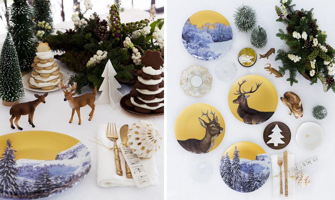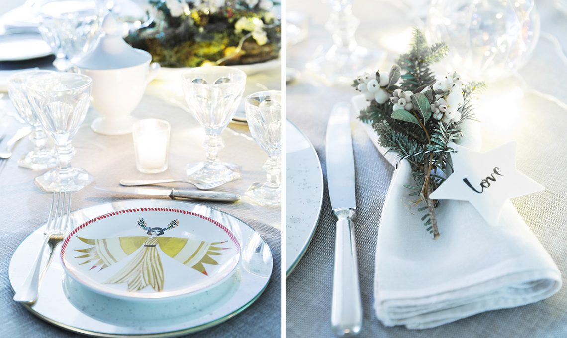 Piatti Mythologie [Fragonard €52], sottopiatti [Funky Table], stelline di ceramica con scritte [GioveLab]. «Basta un rametto di pino su ogni tovagliolo, ed è subito Natale» dice la stylist Elisabetta Viganò.