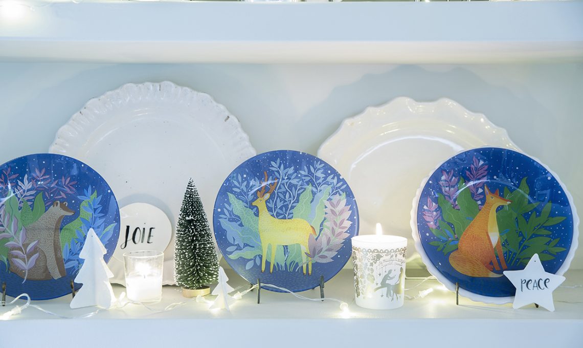 Piatti Forêt Enchantée [Fragonard]. In alto, tealight [Enzo De Gasperi]; pinetti, renne e stelline [GioveLab]; nella zuppiera boule luminose di [Enzo De Gasperi].