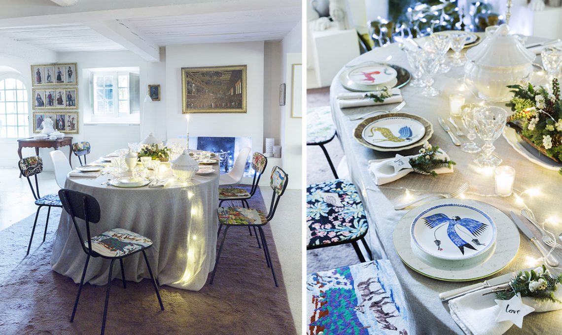 Sedie con sedute rivestite da tessuti ricamati a mezzo punto [Fragonard €220]. La tovaglia è un fai-da-te delle nostre stylist, ed è realizzata con tessuto Cosia [Designers Guild]. Piatti Mythologie [Fragonard €52], sottopiatti [Funky Table], stelline di ceramica con scritte [GioveLab].