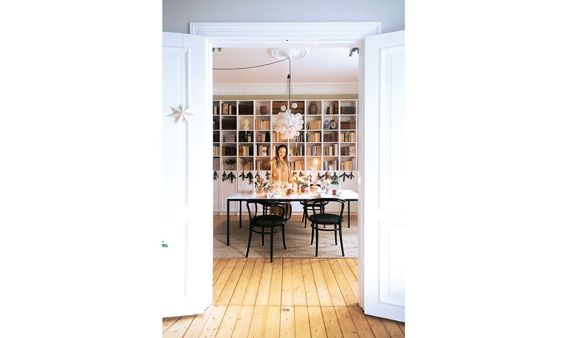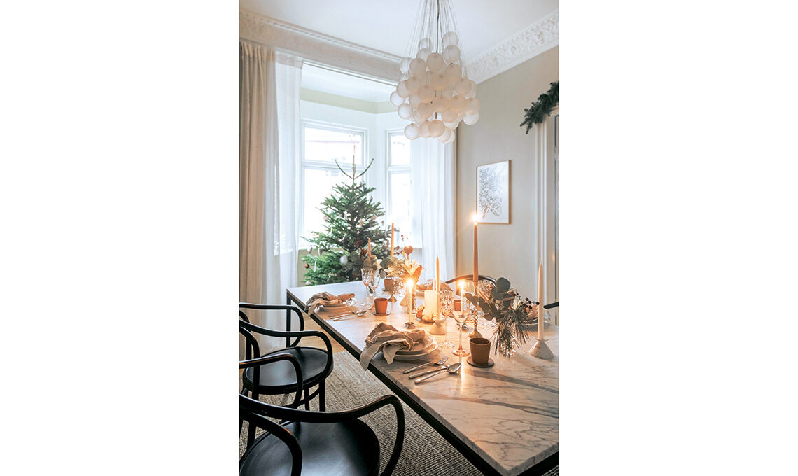 Nella cornice di una casa nordica – gli stucchi, il parquet originale e il bow-window dove ora troneggia l’albero di Natale hanno subito colpito Helene e Mads – il Natale è semplice e chic.