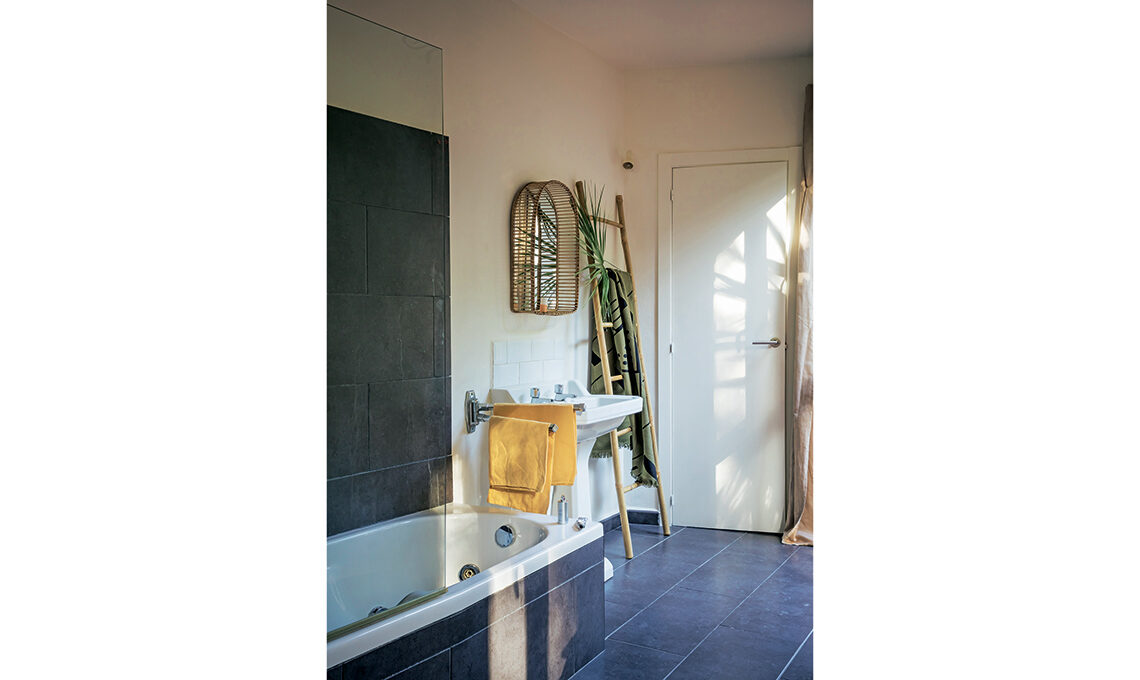Il bagno in una casa di vacanza deve essere essenziale. La scaletta porta-salviette in bambù unisce décor e praticità.