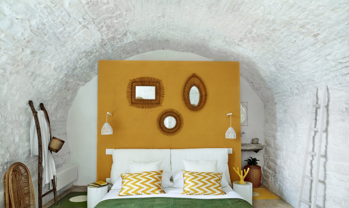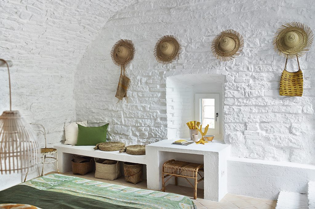 La camera da letto è la ex cantina con una scenografica volta a botte: completamente intonacata di bianco, oggetti insoliti, provenienti dai vari viaggi dei proprietari, si fondono in un mix perfettamente equilibrato: cappelli in paglia cambogiani, specchi in vimini Anni '60... Una quinta color giallo zafferano nasconde una mini-toilette e una cabina armadio. Un'ottima idea per separare le zone senza alterare l'architettura del tetto a botte.