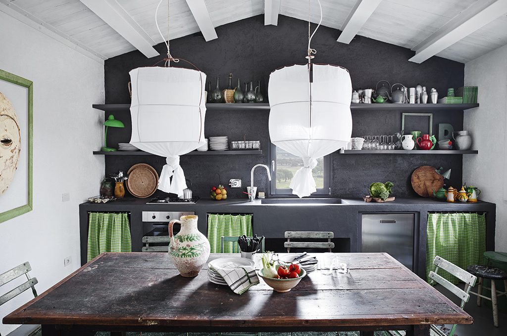 In cucina la parete grigio antracite è bilanciata dal soffitto dipinto di bianco. Lampade in garza Koushi lamp [Mark Eden Schooley su Heimelig Shop] e tavolino fratino rustico.