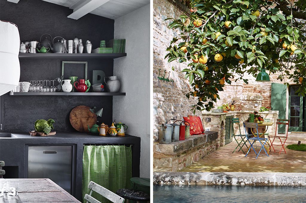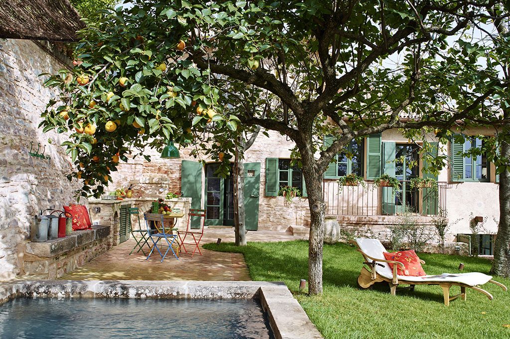 Fuori, il giardino è uno scrigno verde incastonato tra i vecchi muri di pietra. E se gli amici capitano all’ora di pranzo, si fermano qui, all’ombra del grande albero di cachi, in una zona en plein air con sedie e tavolino in ferro di tanti colori comprati ai mercatini. La cisterna un tempo destinata alla raccolta dell’acqua è stata convertita in una piscina.
