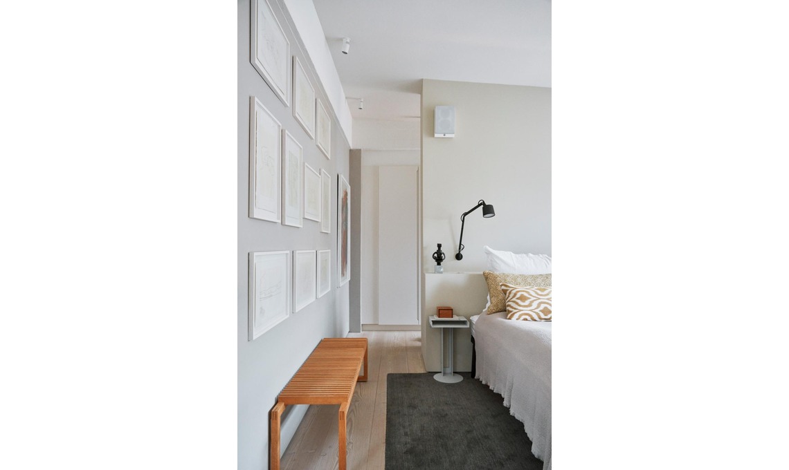 Anche la camera da letto ha uno stile minimal e tonalità chiare e naturali. Una parete è occupata da una composizione di quadri a cornici bianche. Se vuoi creare un gioco di nuance, scegli sulla