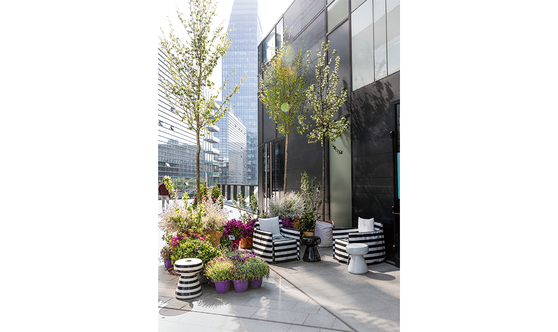 La sfida era trasformarlo in un spazio d’atmosfera. Abbiamo cominciato dalla natura, perché solo coltivando le nostre radici puoi vivere davvero nel futuro. I nostri esperti del verde Lefty Gardens hanno allestito un giardino urbano con meli da fiore, Bougainvillea, Dipladenia sanderi, lavande e cespugli di Eremophila nivea.