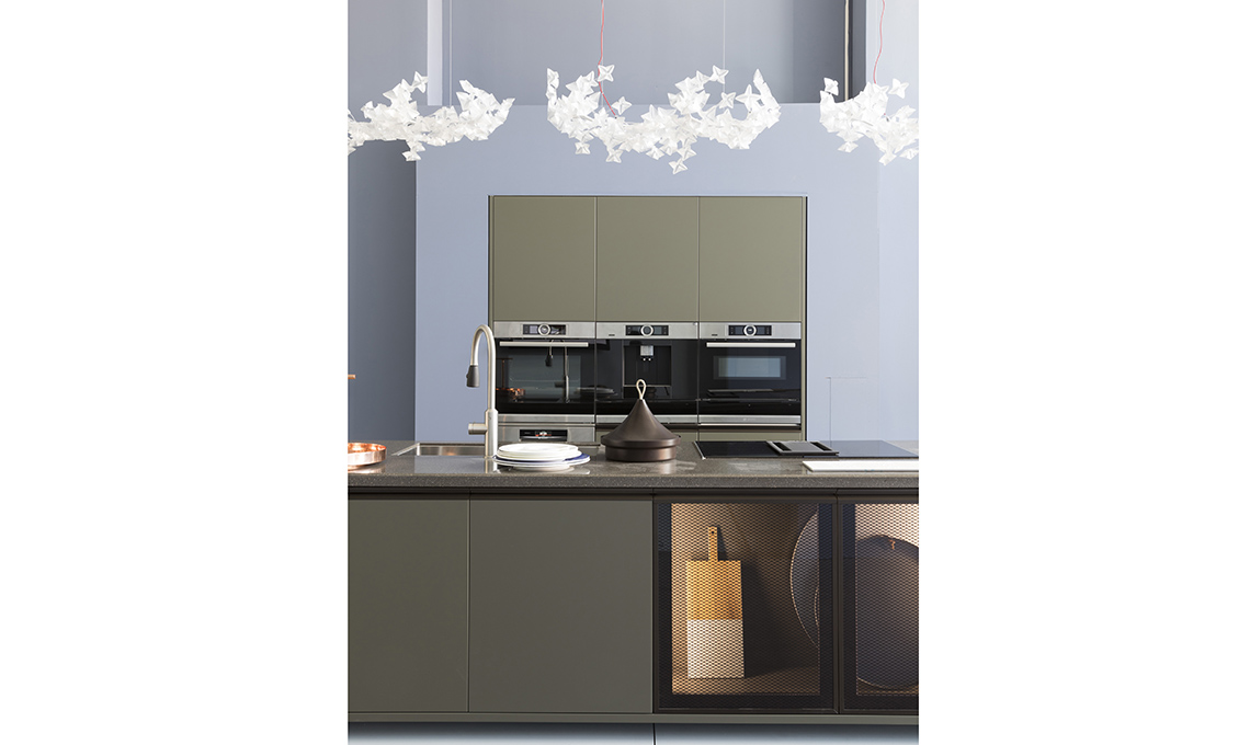 [Scavolini]. Alterna ante in laccato Opaco Verde Minerale e ante telaio Bronzo con vetro Ribbed Glass. Mini elettrodomestici [Bosch], accessori da cucina [Tescoma]