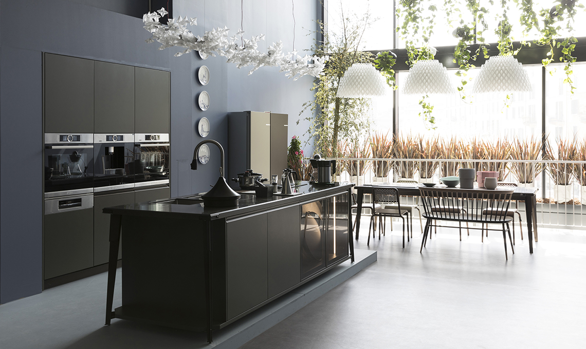 Per l'area cooking abbiamo scelto la cucina Diesel Open Workshop di Scavolini perché ha un approccio caldo all’ambiente e una decisa ispirazione industriale. Il top è in Corian® Deep BedRock: super resistente al calore e agli urti. Gli elettrodomestici di Bosch sono di ultima generazione. Il display del forno a vapore ti guida nell’esecuzione della ricetta; il forno a microonde è dotato di funzione vapore e la macchina del caffè si programma anche da remoto. Il piano cottura a induzione Venting Cooktop è in vetroceramica e ha ha la ventilazione integrata e una piastra in ghisa che diventa un comodo piano d'appoggio. Durante la Milano Design Week, questa cucina l’abbiamo messa alla prova con più di 20 ricette e show cooking.