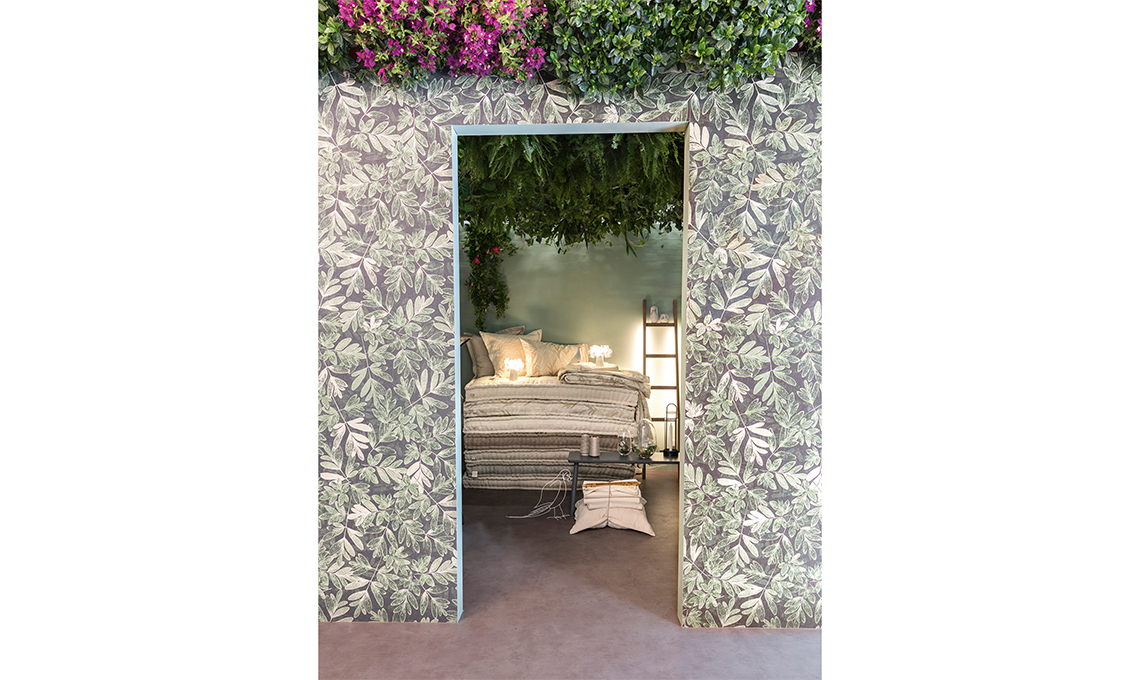 Di fronte, la green room, rimanda ad un'atmosfera incantata con il tetto di piante, le luci d'atmosfera e tessili eleganti e sofisticati di Gabel. La pila di materassi foderati in puro cotone racconta l’importanza del buon sonno e dei materiali naturali.