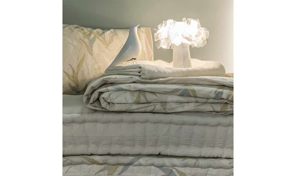 Lenzuolo e completo copripiumino Algae collezione Naturae, copriletto in tessuto jacquard tinta unita [cm 270x250 €66], tutto di [Gabel]. Lampada portatile e ricaricabile Clizia Battery [Slamp, ø cm 27x25h €175]