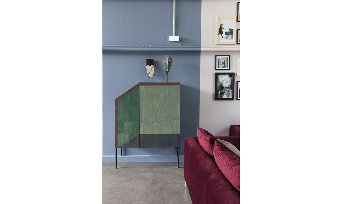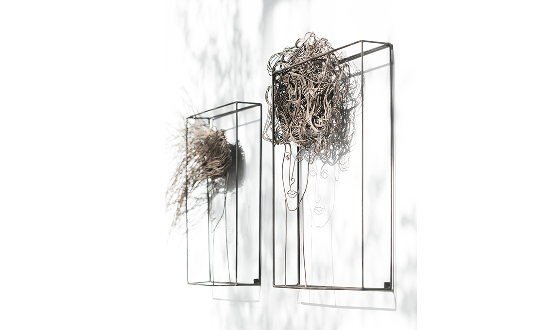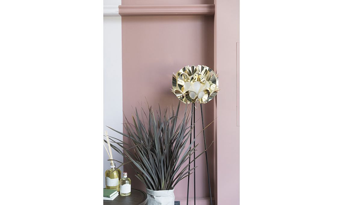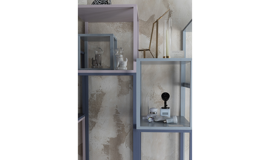 L’effetto materico della parete è ottenuto con Calce Cruda – Stencil Mandala Fusion [Novacolor]. Sulle scaffalature, oggetti tra arte e artigianato [da sinistra: Mogg, Piatto Unico, Atelier Macramè, Lisa Lloyd, Agustina Bottoni, Giovanni Scafuro, De Castelli - Gum Design, Galleria Secondome, PaolaC, Bosa, Lladró, Edison, Corrado Corradi]. Camaleonte paper art