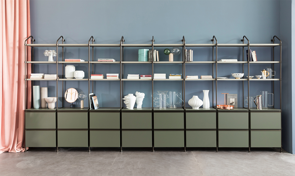 realizzata con il sistema Stock Rack di Diesel Open Workshop [Scavolini]. Progettata combinando mensole laminate Rustic Grey e basi sospese opaco Verde Minerale, rette da tubolari di metallo modulari alti cm 236. Specchio [Colè], vasi [Rina Menardi, Cappellini,