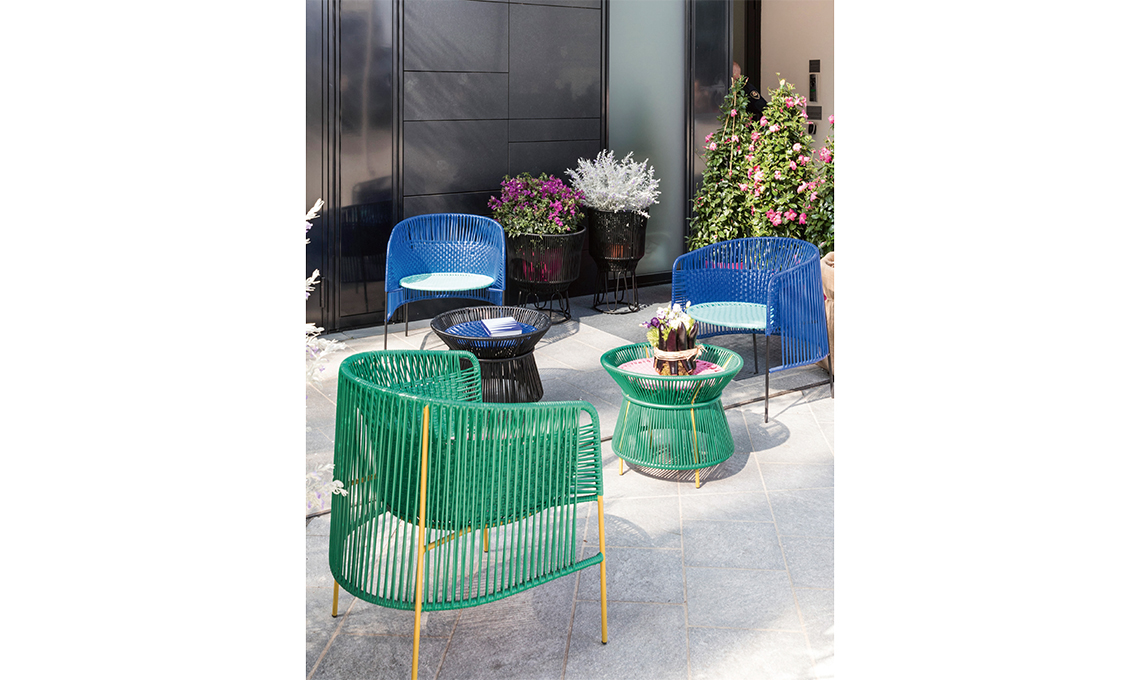 Attorno alle poltrone Ghost Out 05 e ai tavolini/pouf in ceramica [Gervasoni], giardino con meli da fiore, Bougainvillea, Dipladenia sanderi e un mix di lavande. I cespugli bianchi sono di Eremophila nivea, una pianta australiana [tutto di Mati 1909 e Orticolario]