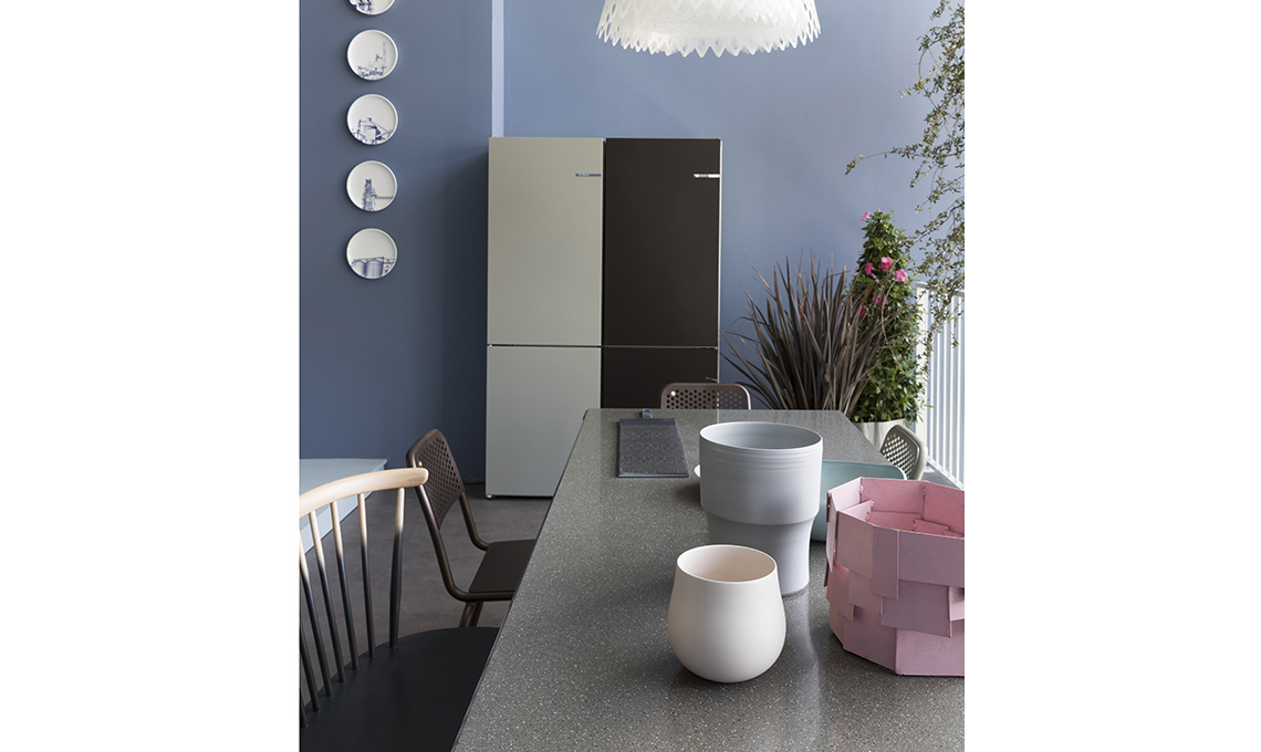 Frigorifero Vario Style di Bosch a cui puoi cambiare i pannelli magnetici [Il costo del frigorifero, cm60x66x186h, comprensivo di un set di pannelli, è di €1.099. Set aggiuntivi €190]