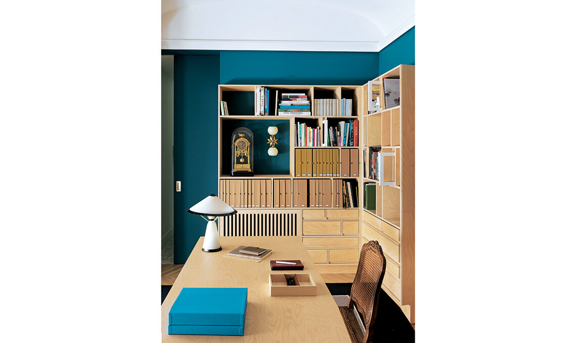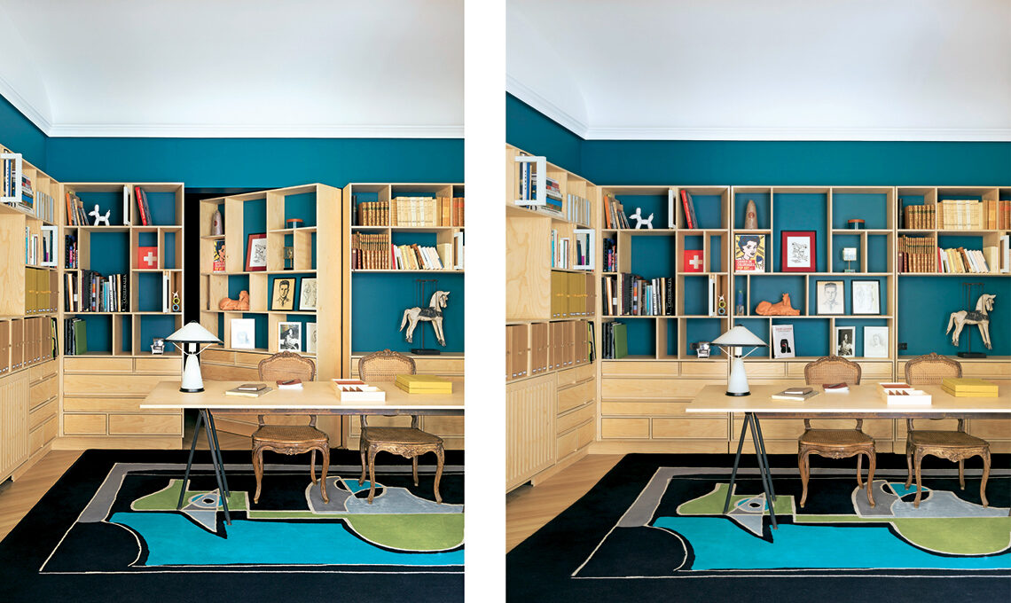 tappeto Contrebasse, design Vincent Darré [cm 200x300 € 4.536 su theinvisiblecollection.com]. Cerchi sedie d’epoca come quelle in foto? Digita ‘sedie Luigi XV in paglia’ su [subito.it]. E per saperne di più su come funziona una libreria pivotante, vai nella sezione ‘Progetti’ di [fritsjurgens.com/it].