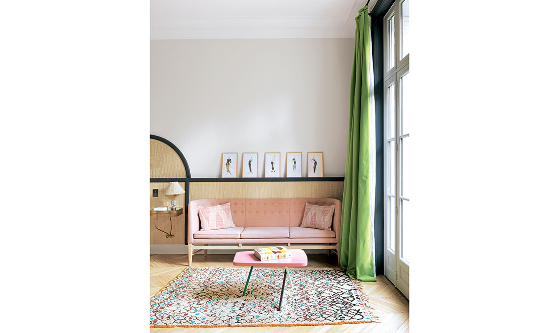 è di François Lemoyne. Divano giallo Jelly Pea di [India Mahdavi]. Sul camino, candelabri design Jimmy Delatour, acquistati dalla [Galerie Armel Soyer] di Parigi. Kilim iraniano d’epoca.