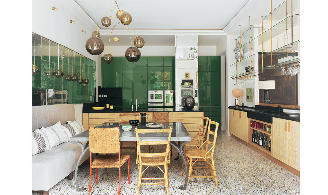 Il mood della casa innesta geometrie e lampi color verde lacca su materiali senza tempo, quali il pavimento in terrazzo veneziano e in palladiana o i mobili in rattan.