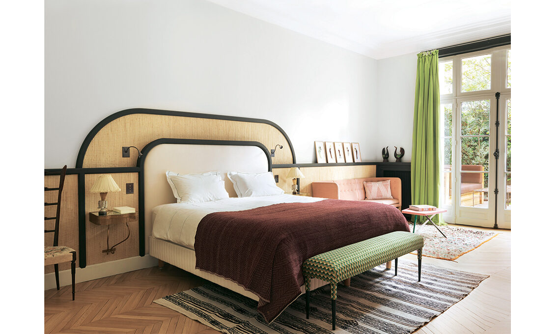 La testata del letto è rivestita in parte con lino [Pierre Frey], comodini da [Design Market], le lampade da comodino sono cimeli di famiglia. Lenzuola coll. Alma, plaid e tappeto tutto [Maison Sarah Lavoine]. La panca è stata progettata da Marte 360 Design e rivestita con tessuto Arlequin [Le Manach].