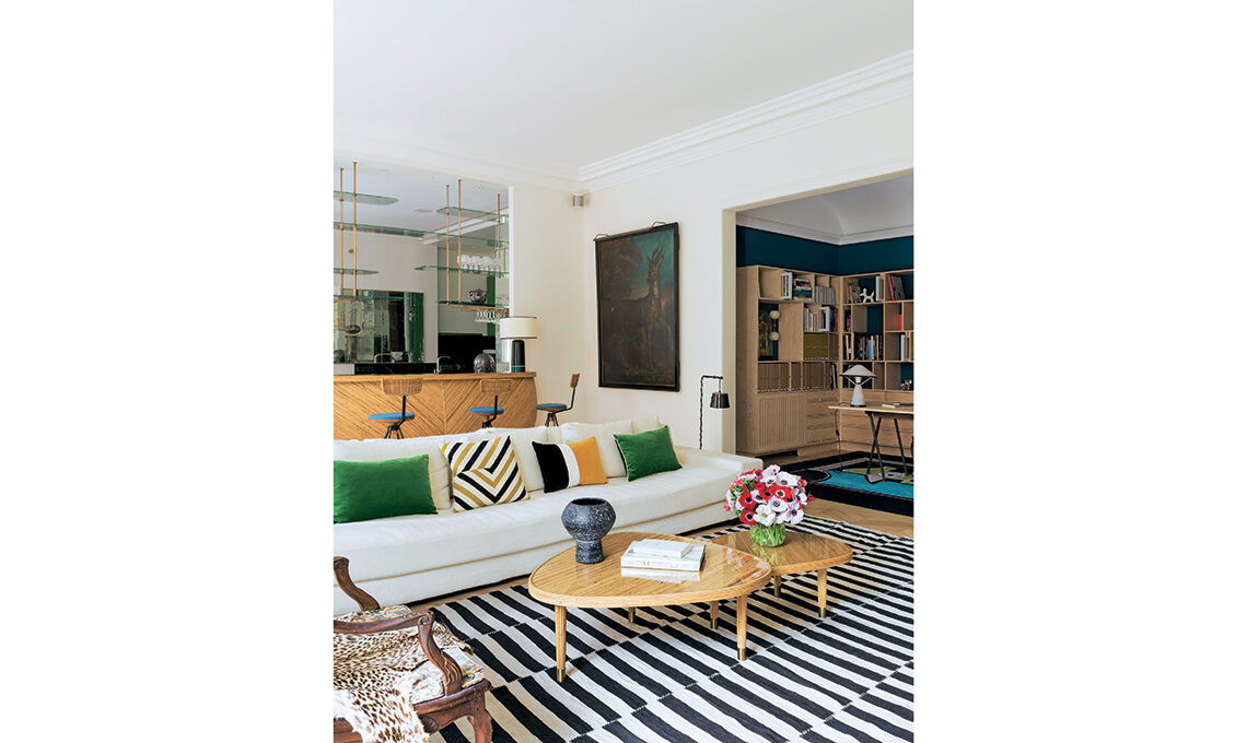 Divano di [Christian Liaigre], cuscini [India Mahdavi] e [Sarah Lavoine], tavolini Weekend di [India Mahdavi], vaso [The Conran Shop]. Il dipinto del cervo è ‘Chevreuil dans la forêt de Rastatter’ di Juan Gariete (1748): è stato acquistato da [Axel Vervoordt], celeberrimo mercante d’arte e designer d’interni. A destra, sgabelli vintage acquistati su [Pamono].