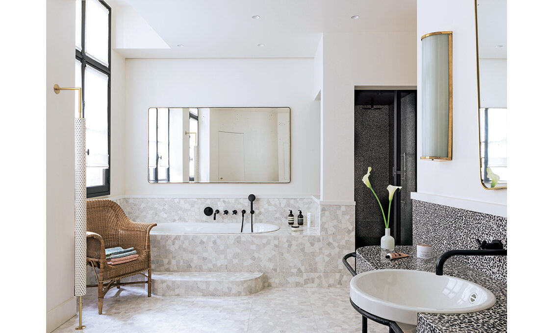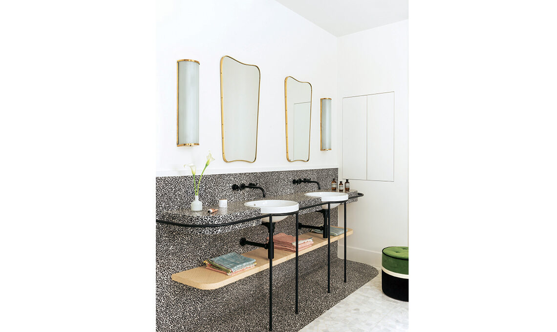 La console lavabi è un progetto di Sarah Lavoine, in terrazzo veneziano e acciaio martellato. lavabo [Alape], rubinetteria [Dornbracht], specchi e applique by Gio Ponti, asciugamani coll. Goa Maison [Maison Sarah Lavoine].