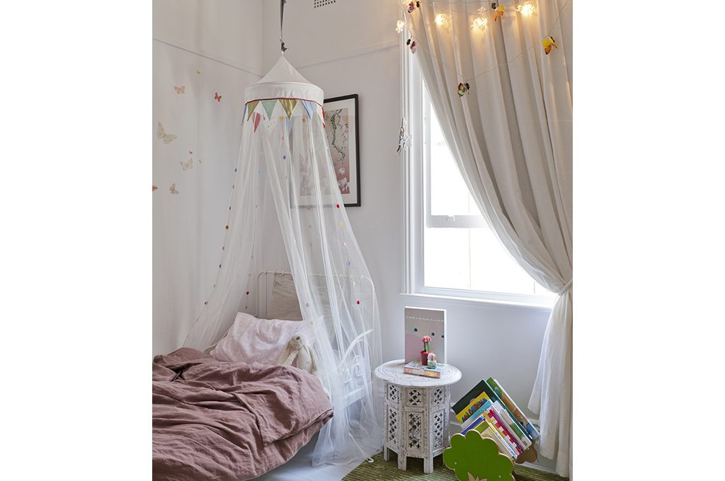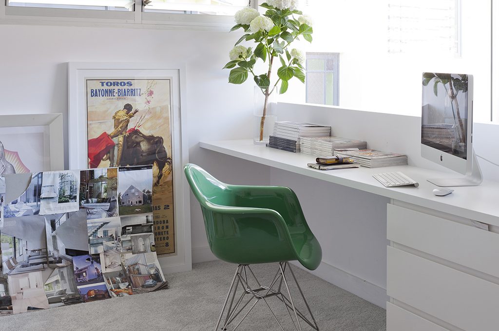 I padroni di casa hanno viaggiato molto nel nord America e in Europa prima di comprare questa casa a Bondi Beach, una nota spiaggia vicino a Sidney. Queste esperienze hanno influenzato la scelta e la sistemazione della loro casa. L’esigenza era trovare un’abitazione unifamiliare con giardino, ma dopo una lunga ricerca la coppia stava per rinunciare a causa dei prezzi elevati. Non volendo cedere all’idea di un appartamento, la soluzione è arrivata quando li hanno portati a vedere un cottage dei primi del ’900 circondato dal verde. Subito si sono messi all’opera e con un’amica architetto hanno progettato l’ampliamento della casa. Obiettivo numero 1: spazi senza confini, sia con l’esterno sia tra le diverse funzioni. A cominciare dalla stanza soggiorno+cucina+relax in cui il giardino sembra davvero entrare dalle finestre: oltre i divani, le vetrate trasformano il salotto in un portico. La luce abbagliante e l’aria profumata della spiaggia si percepiscono in ogni ambiente della casa. Nel living, l’isola della cucina con gli sgabelli confina con la zona pranzo e con l’angolo relax senza alcuna distinzione degli spazi. È un vero open space multifunzione: cucinare, pranzare e chiacchierare sono attività che fanno parte dello stesso piacere di stare insieme. La cucina è in soggiorno ma si rende praticamente invisibile: total white, permette di rimettere ogni cosa a posto quasi scomparendo! enlightenedSe ti piace una cucina in cui tutto è al chiuso o se hai bisogno di molti vani contenitore, copia l’idea dei pensili a tutta parete, ma con l’accorgimento di due profondità diverse: danno leggerezza e ‘movimento’. Tra il banco a isola, con piano in Corian® e il salotto sobrio ed elegante, il tavolo in legno grezzo spezza con il minimalismo. Contribuiscono a scaldare l’atmosfera le poltroncine industriali in acciaio laccato verde che richiamano le sfumature dell’esterno. enlightenedTi attira l’idea del pavimento in cemento? Devi sapere che il costo diminuisce con l’aumentare dell’ampiezza della superficie da ricoprire: più è grande, più vantaggioso sarà il prezzo; in ogni caso, non è una soluzione conveniente per aree inferiori a 100 mq. In una situazione come questa il cemento è una scelta intelligente, perchè evita interruzioni di materiale tra interno ed esterno: esistono, infatti, dei cementi adatti a entrambi gli usi, sono a basso spessore e realizzati con resine e additivi silicei. Per saperne di più vai su www.pavimentisulweb.it  L’involucro della casa, formato dai muri e dagli arredi importanti, deve mantenere un tono neutro per lasciare lo spazio di esprimersi cromaticamente a tutto ciò che si può muovere e può cambiare posizione: dettagli, decori, quadri e oggetti. Per la cameretta invece un baldacchino che ricorda il castello delle fiabe protegge la piccola di casa dalle zanzare e decora il letto allungabile in acciaio verniciato. Distanti dal living al piano terra, dedicato alla vita sociale della famiglia, lo studio e la camera matrimoniale sono al primo piano ed esprimono un desiderio di intimità. La moquette grigia, a pelo corto, sottolinea questo aspetto e invita a muoversi tra le stanze a piedi nudi. Lo studio sfrutta la presenza di due finestre lunghe e basse e ha un’aria informale. La scrivania su misura è molto semplice, i quadri sono a terra (ma d’effetto: idea da copiare!) e un patchwork di foto a tema architettonico dà una piacevole idea di ‘work in progress’.
