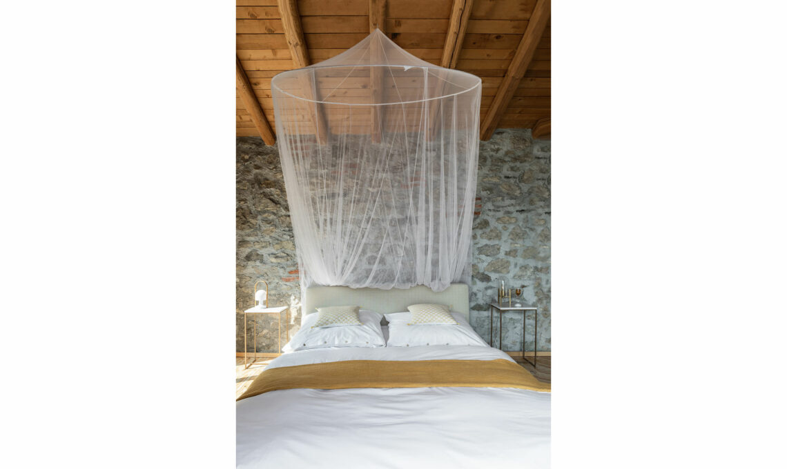 La scelta dei colori di arredi e tessuti illumina ulteriormente la stanza: toni chiari, accesida qualche tocco di giallo oro, e texture ‘lievi’ come la zanzariera sospesa e le tende.