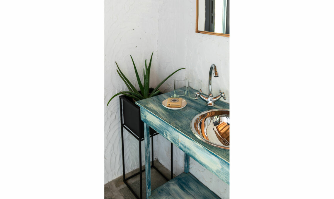 Il bagno è minimale e segue lo stile rustico di tutta la casa. Le pareti, lasciate grezze, sono semplicemente pitturate di bianco, per accentuare proprio il carattere ‘raw’. Il mobile vintage, comprato al mercatino dell’usato, è stato decorato in stile shabby chic da Jakob, con le stesse tonalità delle piastrelle in ceramica sopra la vasca.