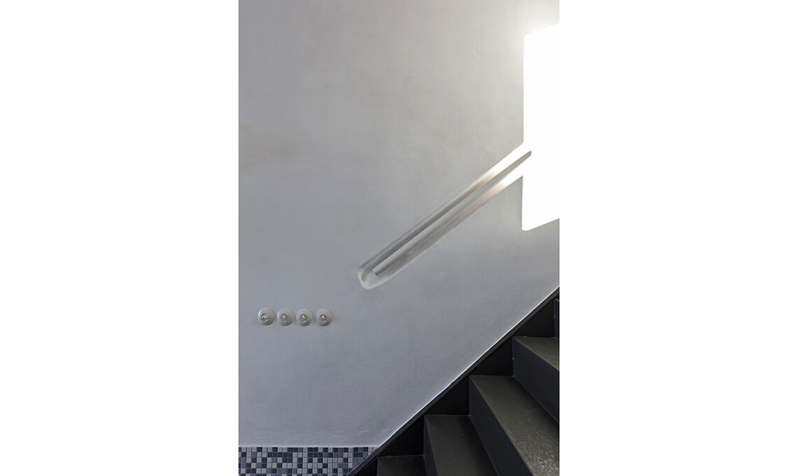 «Entrando qui, ho pensato a una piscina vuota», dice Anna-Maria, «perciò ho scelto di rivestire di mosaico bianco-azzurro il pavimento, le pareti fino a 60 cm e tutta la parete di fondo, alta ben 6 metri». Poi è stato realizzato il soppalco in acciaio per la zona notte. E sotto, una disposizione furba per bagno e cucina...