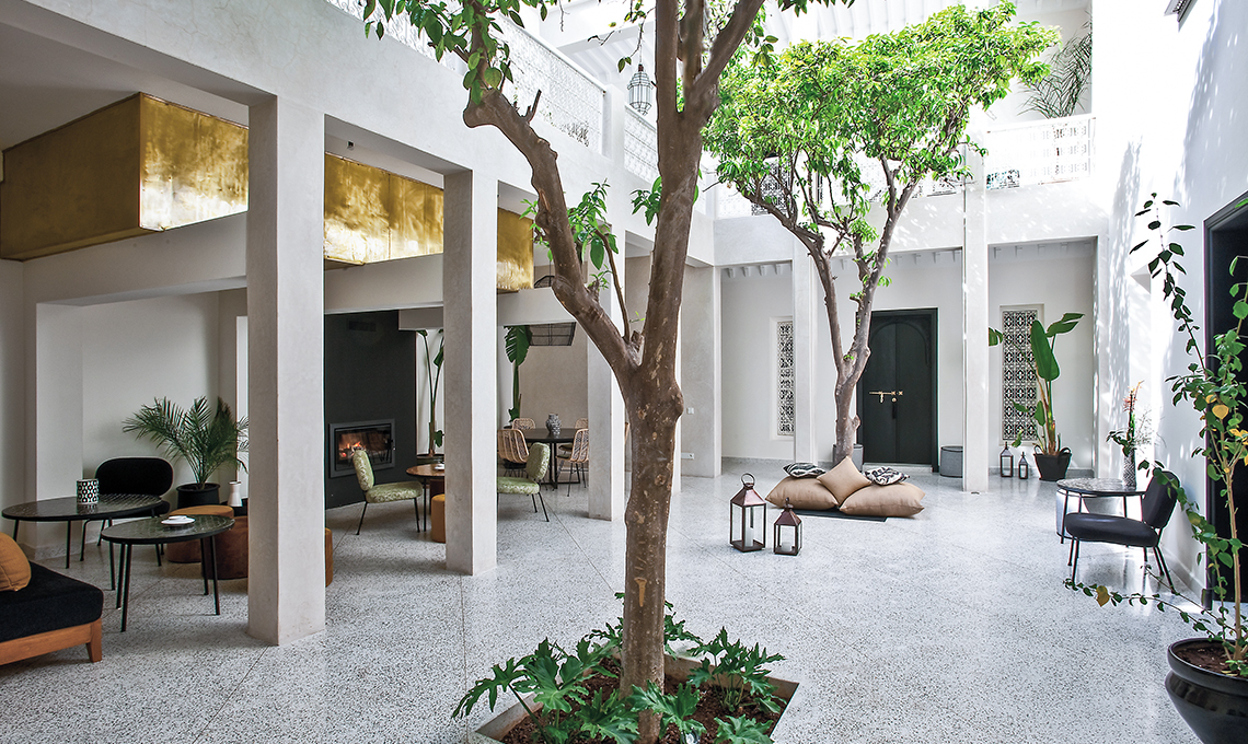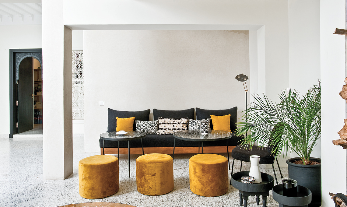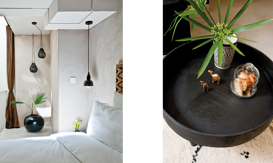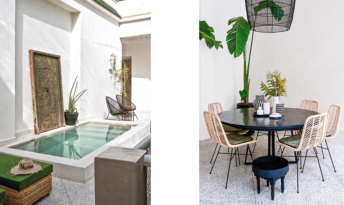 Una ristrutturazione fatta con passione ha salvato elementi antichi e preziosi: le grate e le ringhiere in ferro battuto, i vetri colorati, la stessa pianta. Bianco, nero, toni naturali e lampi di colore brillante: il pattern che torna in tutto il riad Numa trasmette relax e vivacità insieme. Pareti e pavimenti delle camere sono in tadelakt: un’antichissima tecnica marocchina che utilizza calce locale, lucidata con pietre di fiume e poi con sapone nero all’olio di oliva. Una soluzione realizzabile anche in Italia: la superficie è impermeabile, resistente alle muffe e naturale al 100%.