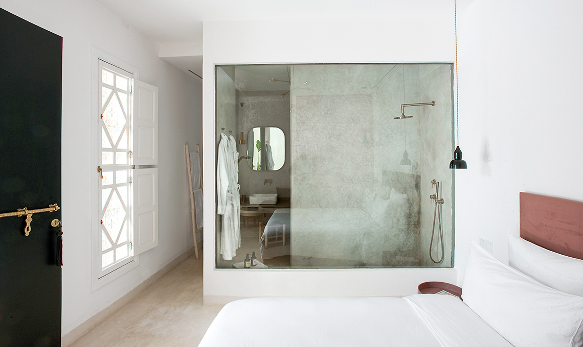 Pareti e pavimenti delle camere sono in tadelakt: un’antichissima tecnica marocchina che utilizza calce locale, lucidata con pietre di fiume e poi con sapone nero all’olio di oliva.
