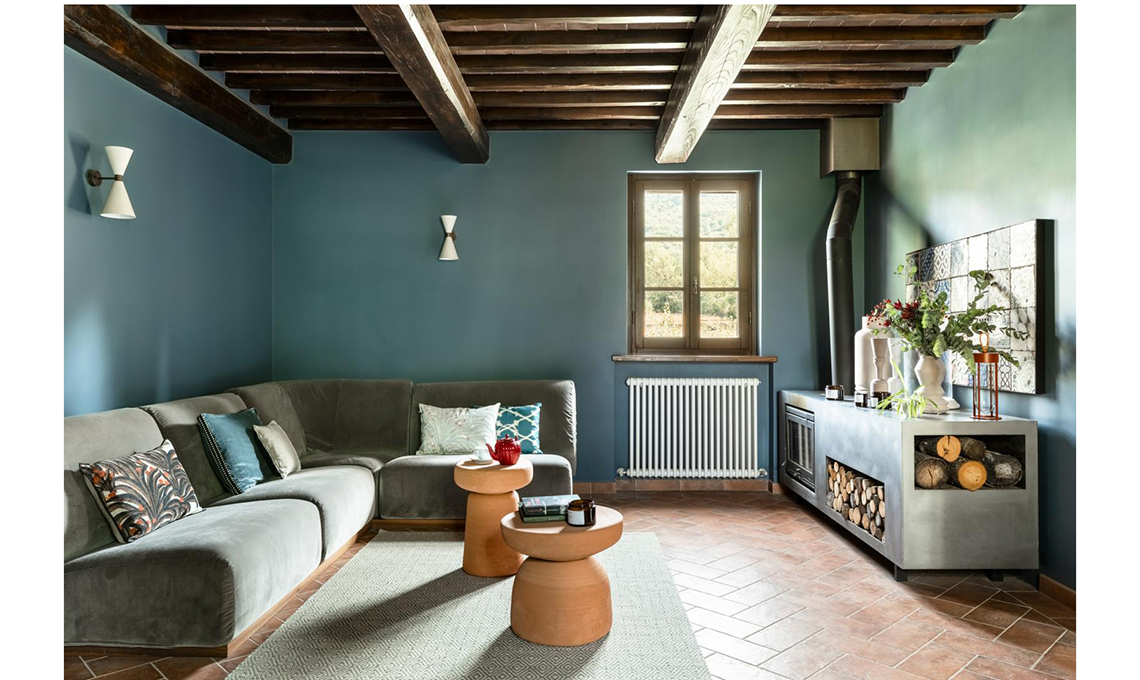 La prima caratteristica saltata all’occhio di Cristina? Il contrasto tra la cucina, luminosa e dalle maxi vetrate, rispetto al salotto, che invece appare scuro e intimo. Il contrappunto tra i due ambienti è ora sottolineato dalla calce a parete, in cucina, e dallo smalto blu, in salotto, che creano una ‘tensione’ opaco/satinato, chiaro/scuro.