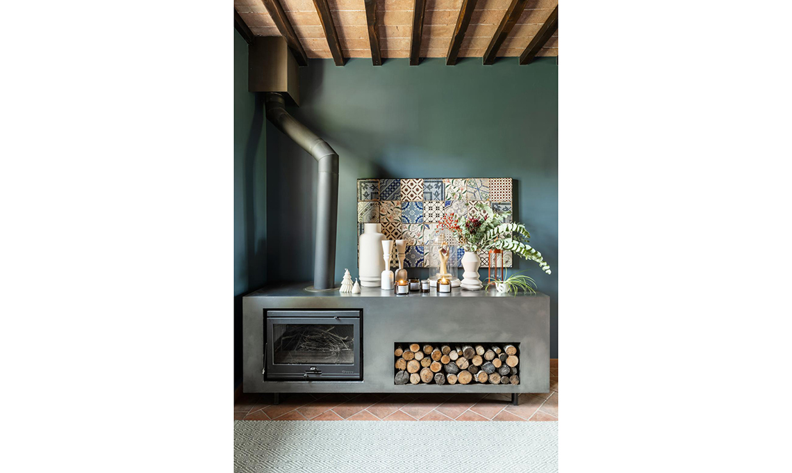 Mentre il divano in velluto grigio è stato disegnato con forme morbide, il camino ha linee nette ed è inserito in una scocca di metallo tagliato al laser, grezzo, imbottita con lana di ruggine per non trasmettere il calore. Sopra, una ‘board’ decorativa di maioliche napoletane e siciliane. Divano, cuscini [Les-Ottomans] e [Élitis].