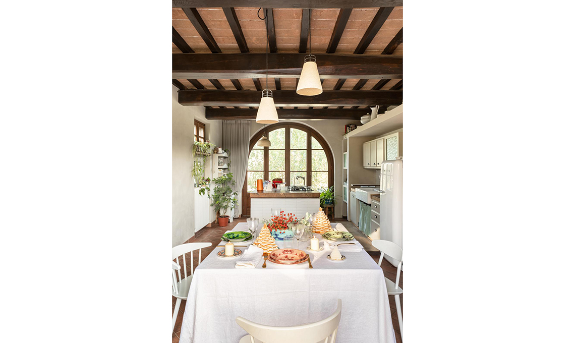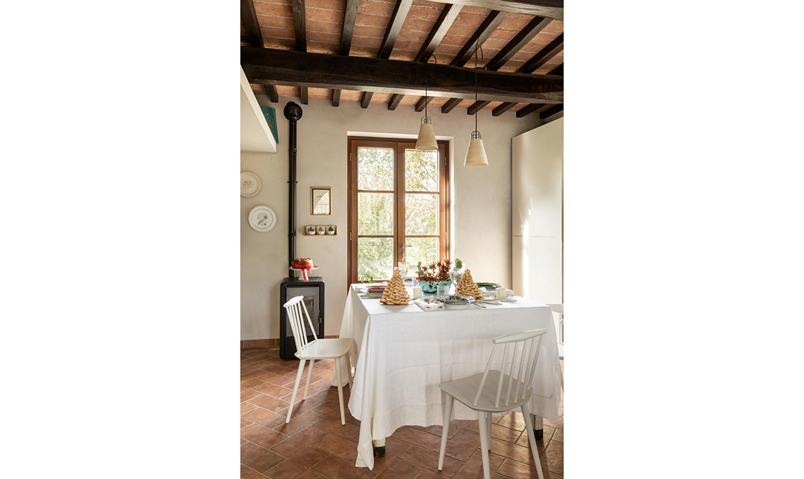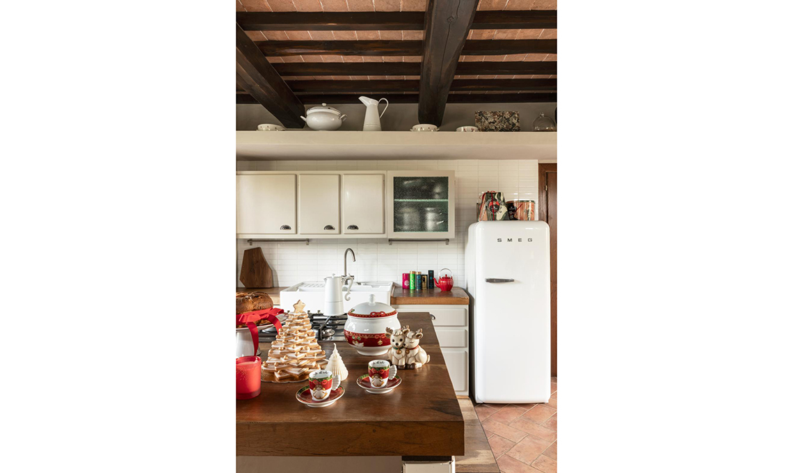 dall’architetto Emanuele Petrucci; sgabelli AAS 38 [Hay] così come le sedie intorno al tavolo, della J-series numero 104 e 77. Piastrelle [Mutina], lavandino [Villeroy & Boch], frigorifero [Smeg]. Caffettiera Lady Anne [KnIndustrie], tazzine, biscottiera e renne [Thun], candele [&Soul], panettone glassato alla nocciola [Hausbrandt]. Sul frigo, panettoni [Giovanni Cova & C.], sul piano della cucina selezione tè [Mariage Frères], prosecco Conegliano Valdobbiadene e brut Nature [Col Sandago].