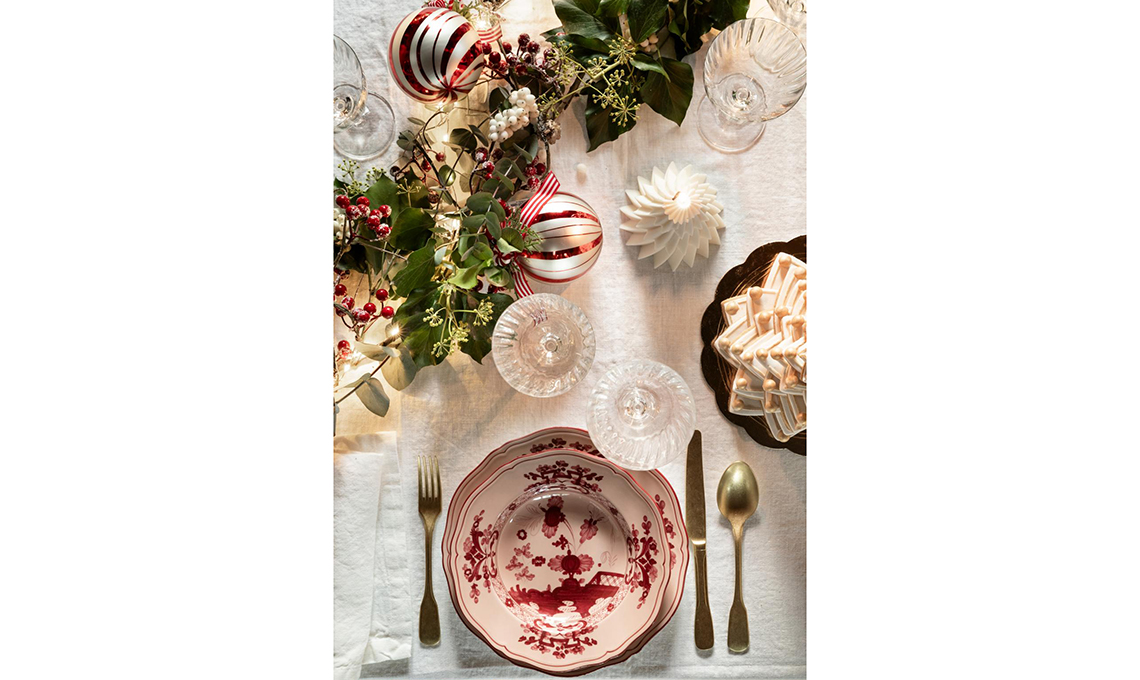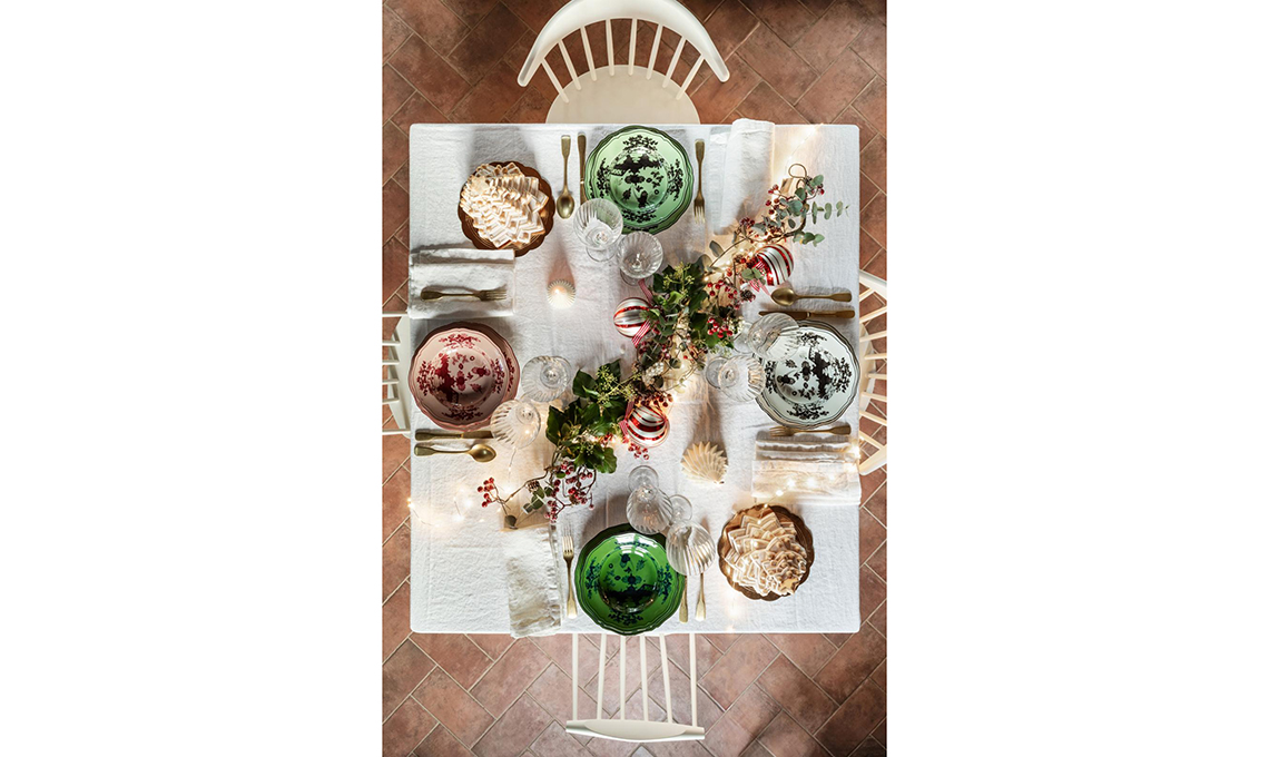in vendita da Lapini Arezzo] così come la zuppiera. Calici e posate [KnIndustrie], alberi di pastafrolla [Dolce], palline e centrotavola [Vertecchi].