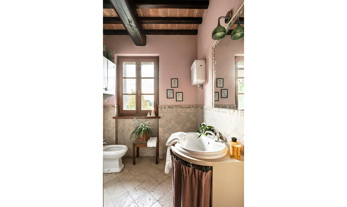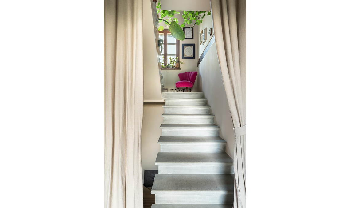 La scala di marmo conduce al piano superiore, dove si trovano le camere da letto. Deliziosa l’idea di rifoderare una vecchia poltroncina