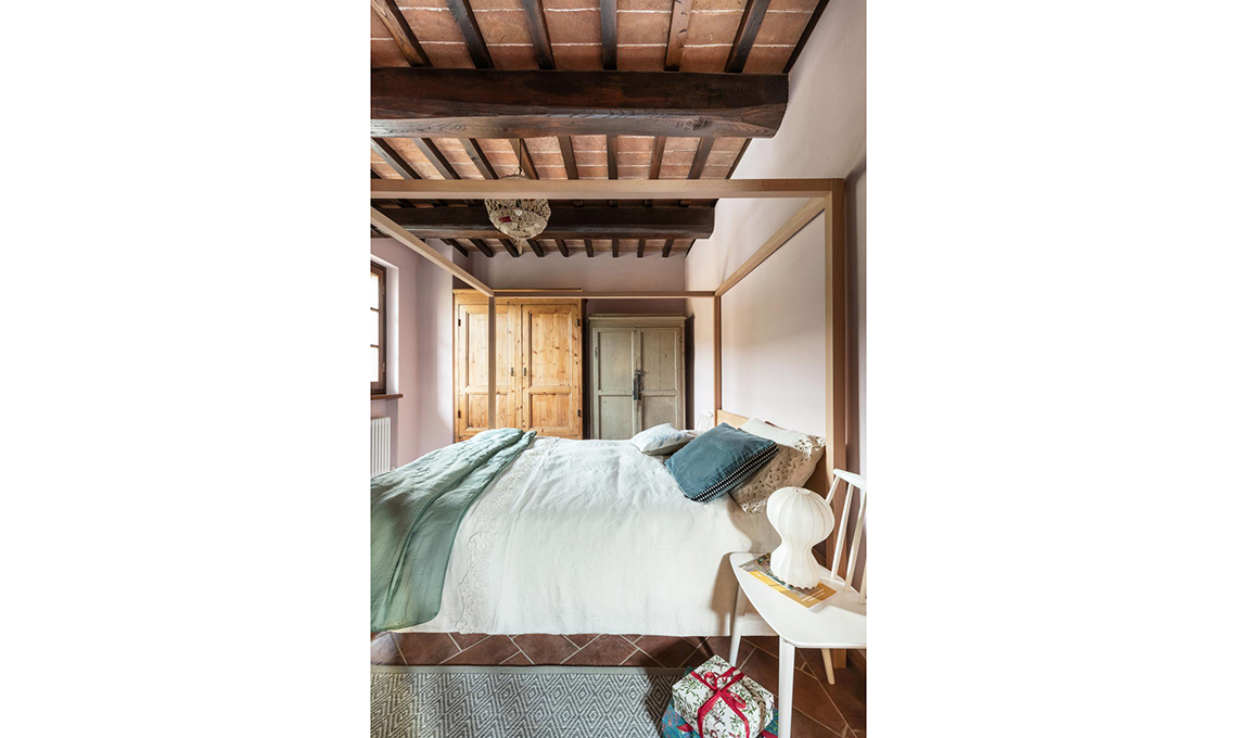«Gli armadi erano due vecchi pezzi da campagna – uno è del babbo di Elena – quindi abbiamo pensato di fare ordine (stilistico) con questo baldacchino dal taglio pulito, quasi zen. Come sempre alla ricerca di una sintesi tra ordine e disordine, vecchio e nuovo» commenta l’architetto Emanuele Petrucci.