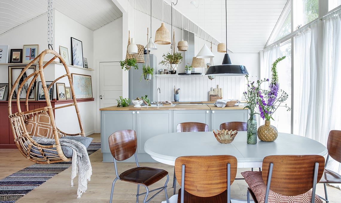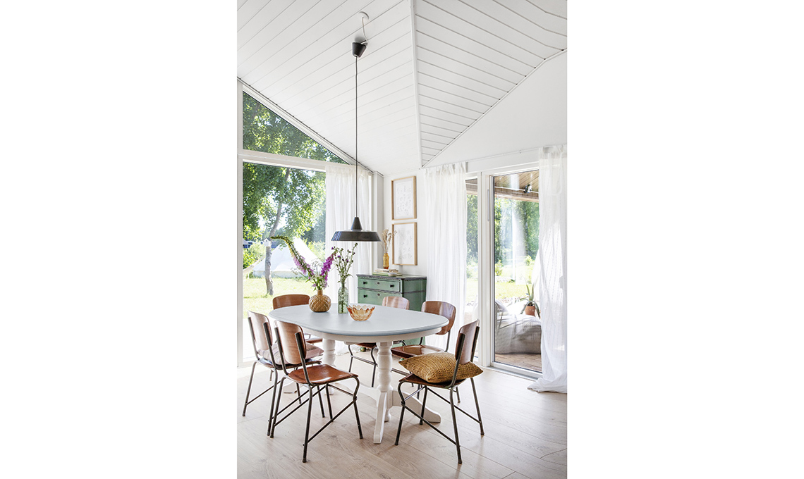 che entra dalla doppia vetrata sul patio e sul giardino. Qui regna il bianco ottico: pareti, soffitto e tende amplificano la luce. Il tavolo in legno è dipinto con i colori della cucina.