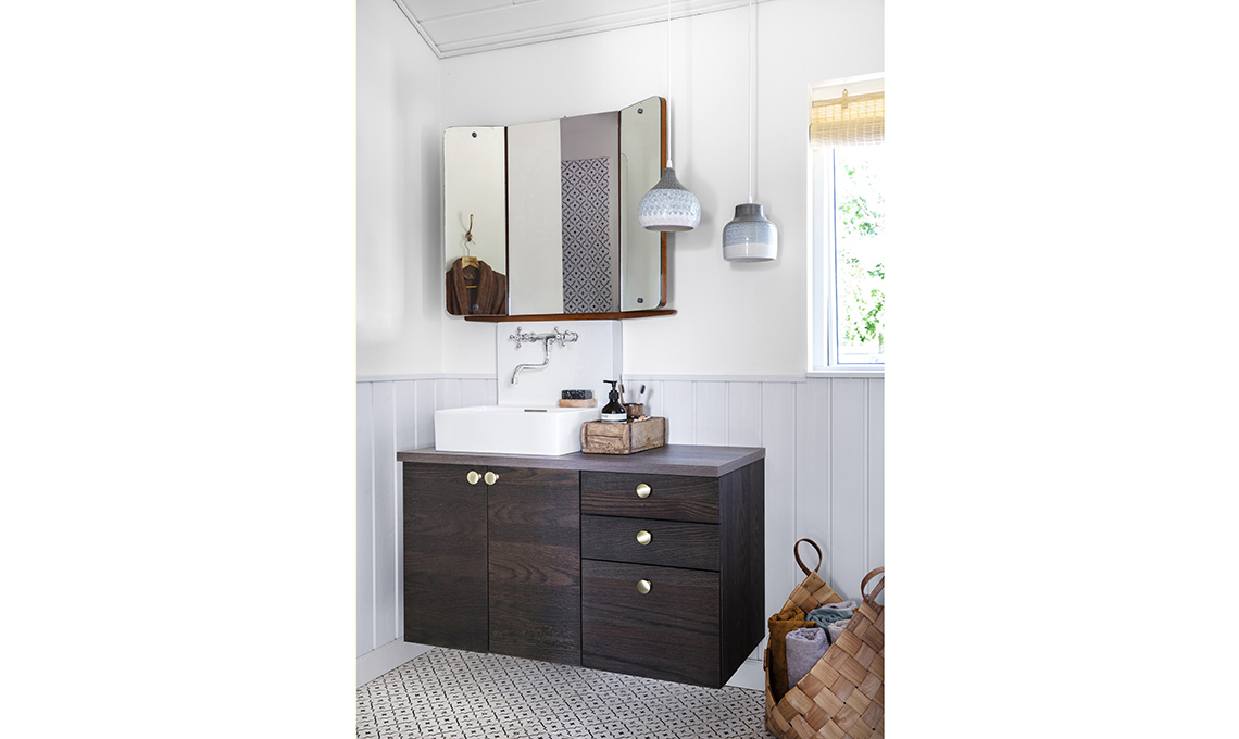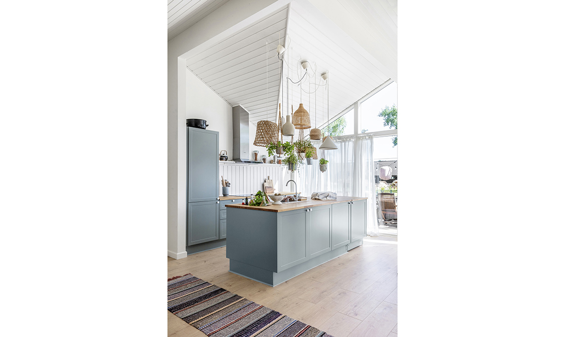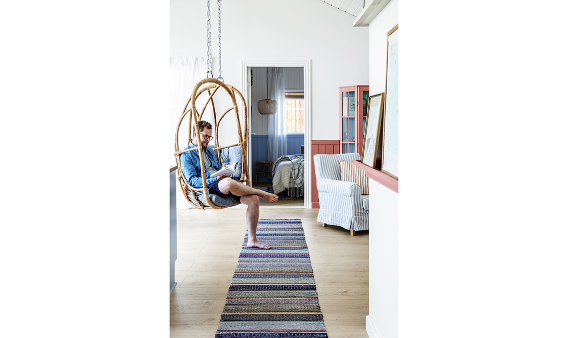 La grande vetrata dà alla zona giorno open space un sapore da veranda. Qui c’è un particolare tutto da copiare: per equilibrare le altezze, Kaspar e Lambang hanno scelto installazioni aeree. Lampade, cachepot in rattan usati come paralumi e una poltrona a dondolo sospesa rendono poetico lo spazio.