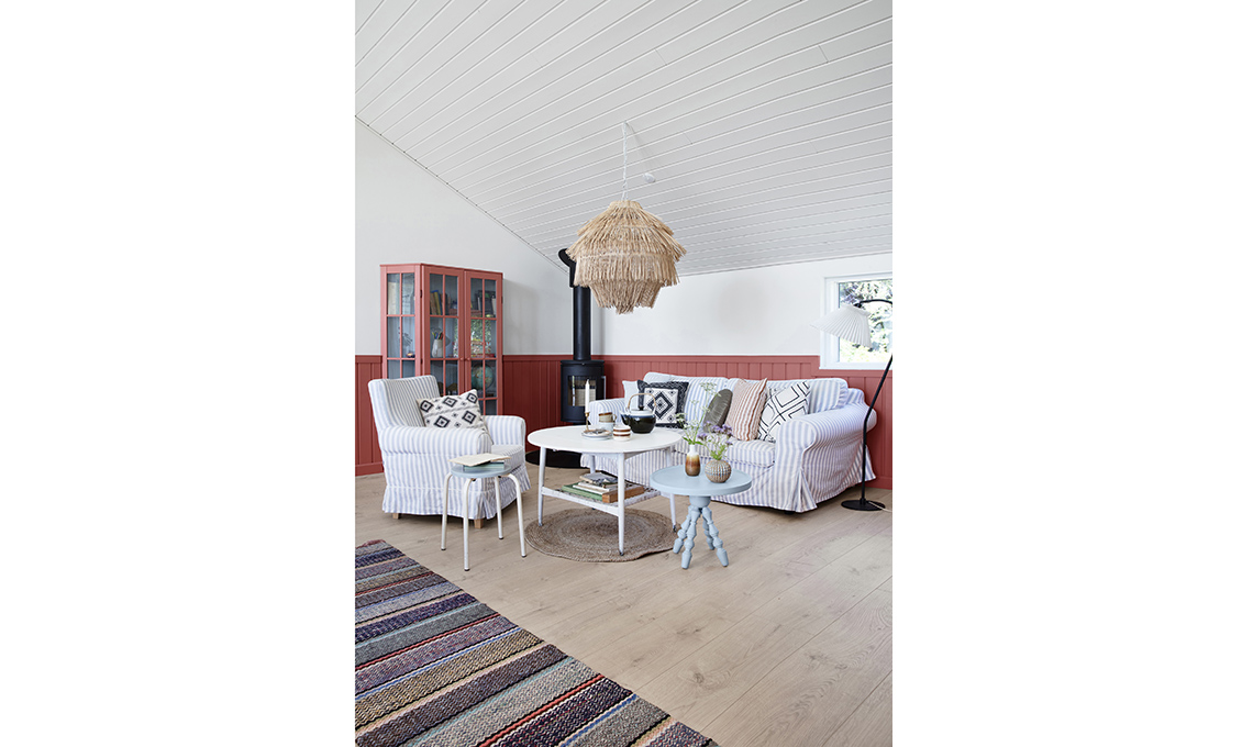 Nel binomio del bianco e ruggine un mix di righe per il divano, la poltrona e il tappeto in tessitura. Spaiati il coffee-table e il tavolino dipinto ghiaccio come la seduta dello sgabello. Beach style la stuoia rotonda e la lampada in paglia. Divano a tre posti e poltrona Ektorp [Ikea].