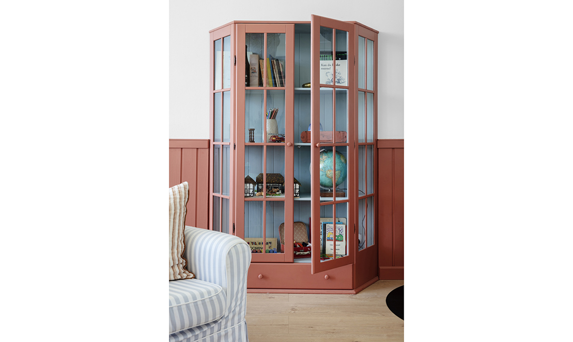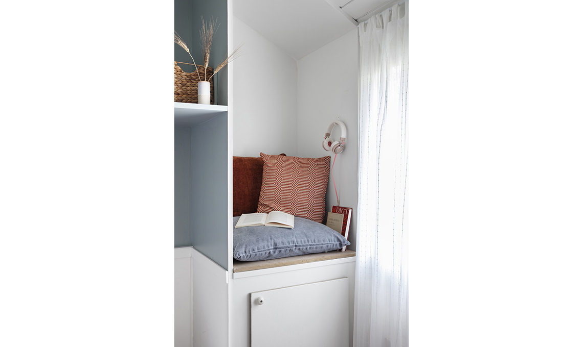 Nel vano accanto alla finestra, l’armadietto è spazio contenitore e mini panca dove leggere e ascoltare la musica. Geniale, no?
