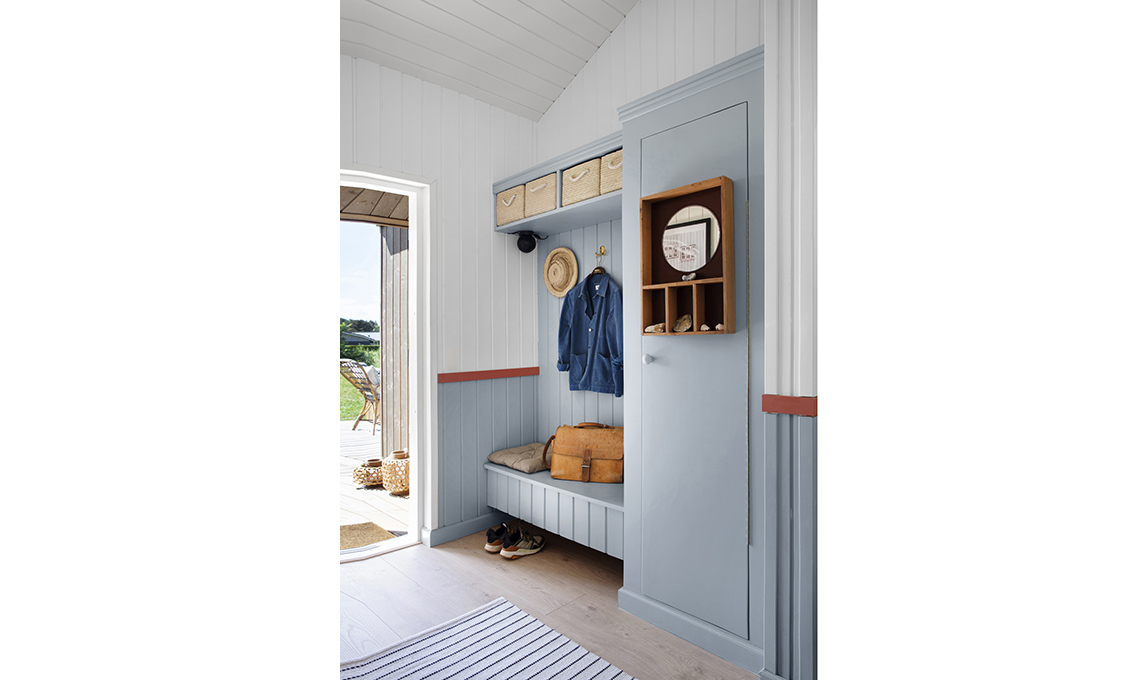 L’ingresso ospita una zona pannellata realizzata su misura, con panca contenitore, appendiabiti e vano con ceste portatutto. Accanto, nel ripostiglio, è stato ritagliato il bagno di servizio.