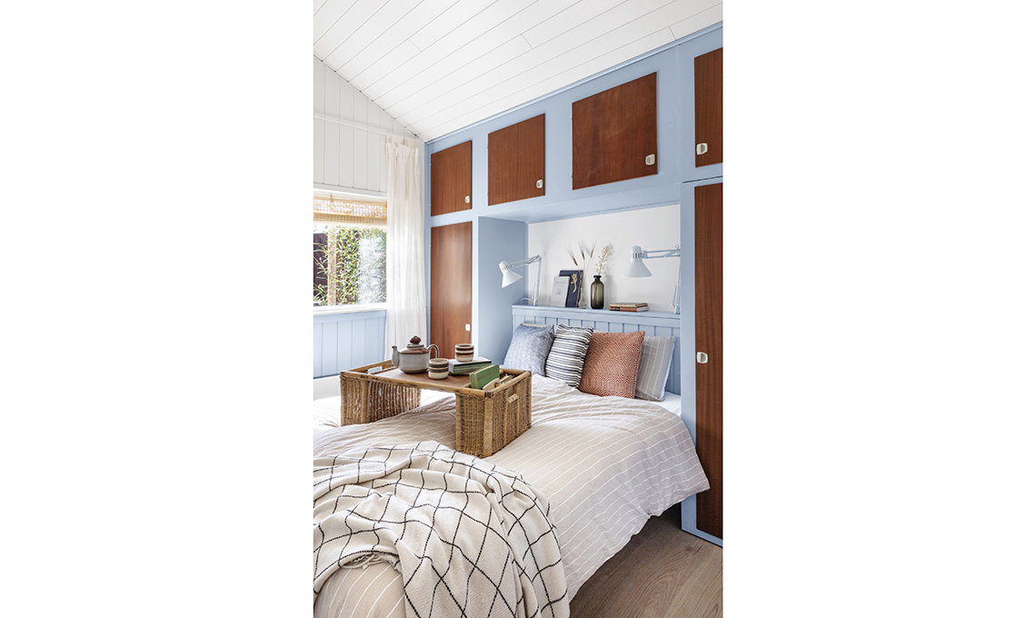L’armadio a ponte sopra il letto è in muratura e, al posto dei comodini, c’è la testata con le luci a braccio avvitate nel ripiano.