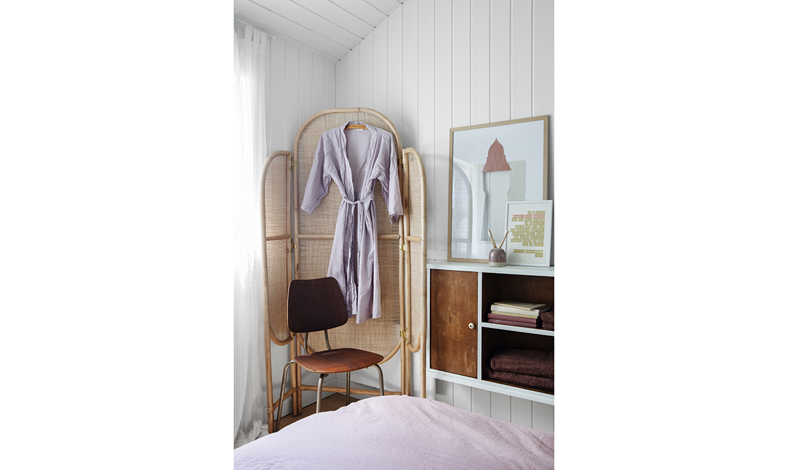 il letto. Nell’angolo, lo sgabello per posare i vestiti è valorizzato da una inattesa lampada a sospensione.