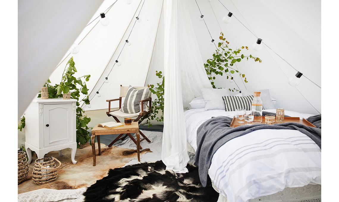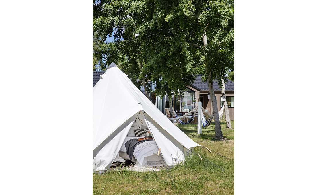Ti piace l’idea di una tenda da usare in giardino, nella bella stagione, come piccolo rifugio relax? Puoi scegliere tra un tepee boho fatto a macramè [Sklum], la tenda Galaxy ecologica per glamping casalinghi [Etsy], o la tenda circolare in canvas Sible [Canvas Camp].