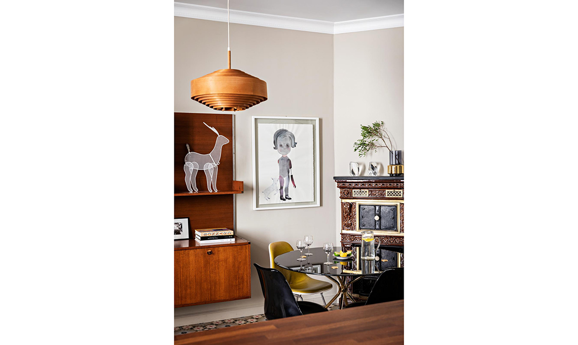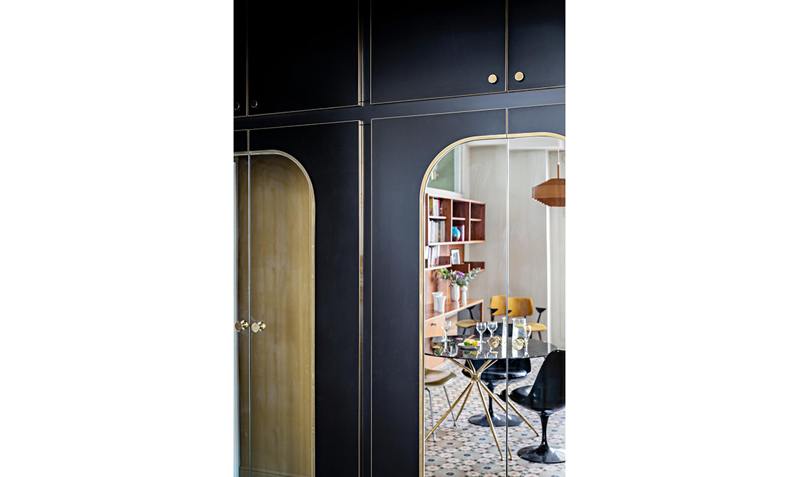 L’armadio che fa da sfondo alla sala da pranzo è un su misura progettato con un’estetica Déco e delle ante in formica nera su cui si incastonano specchi curvi bordati d’ottone. La prospettiva si moltiplica!