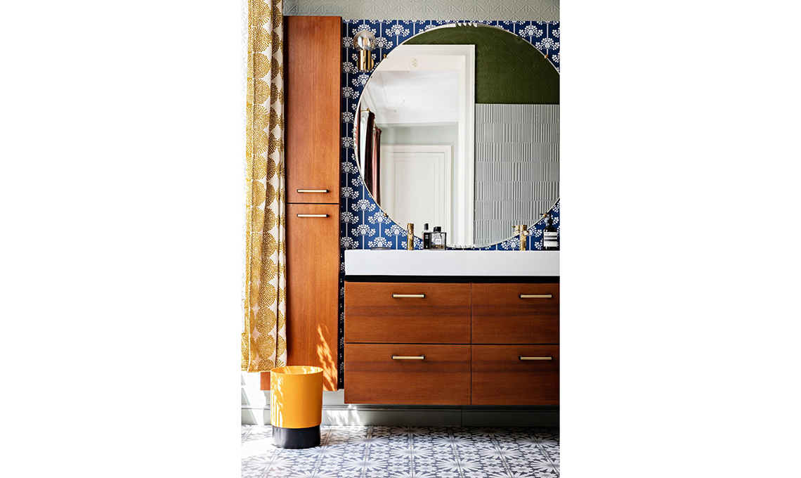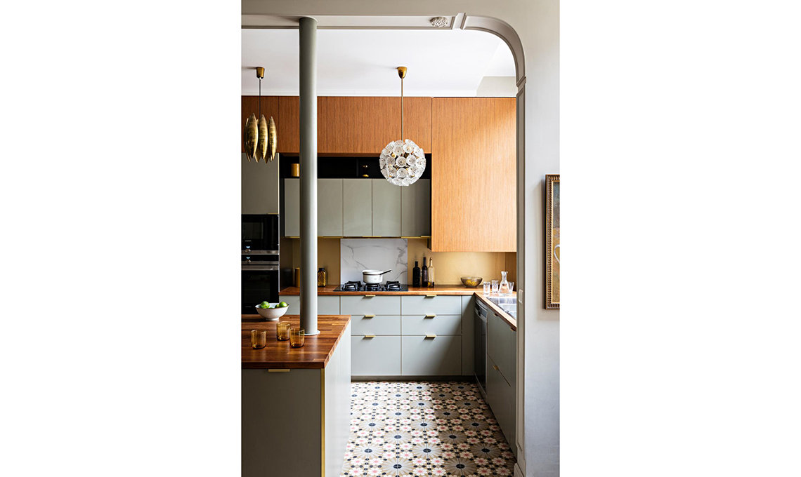 La cucina ha un’allure preziosa ma nasconde tante trovate interessanti: la struttura è Ikea, le ante invece sono di Bocklip, un sito specializzato nella personalizzazione degli arredi svedesi. Evidenziate con bordature e maniglie dorate, riprendono il grigio/verde delle cementine.