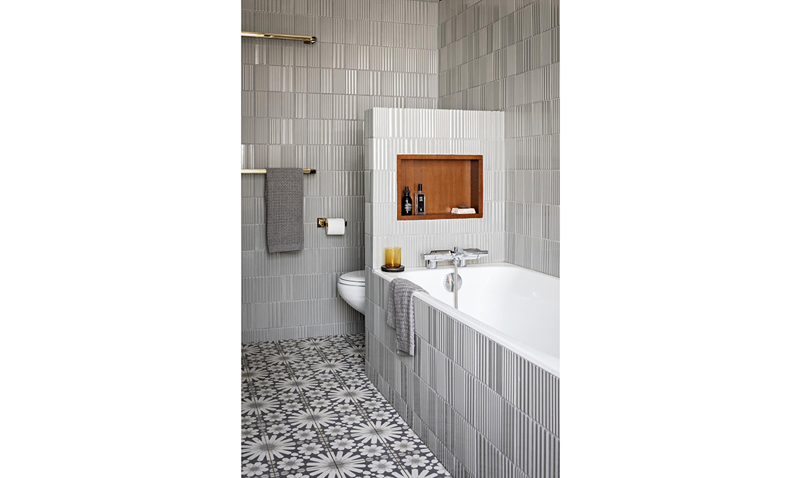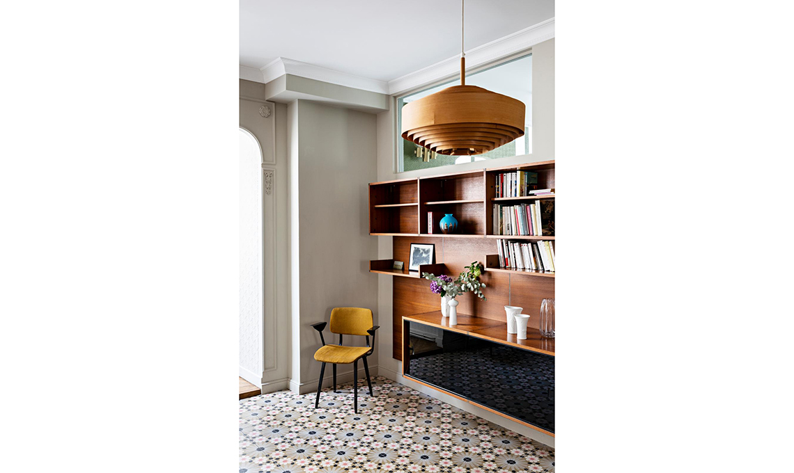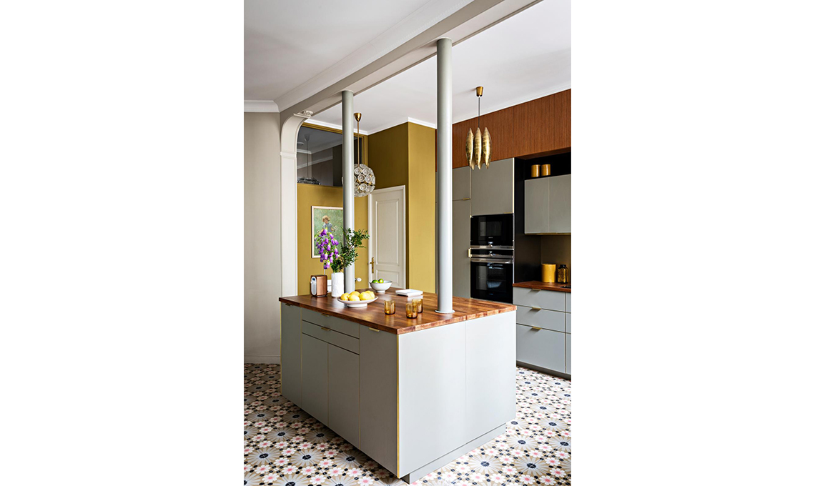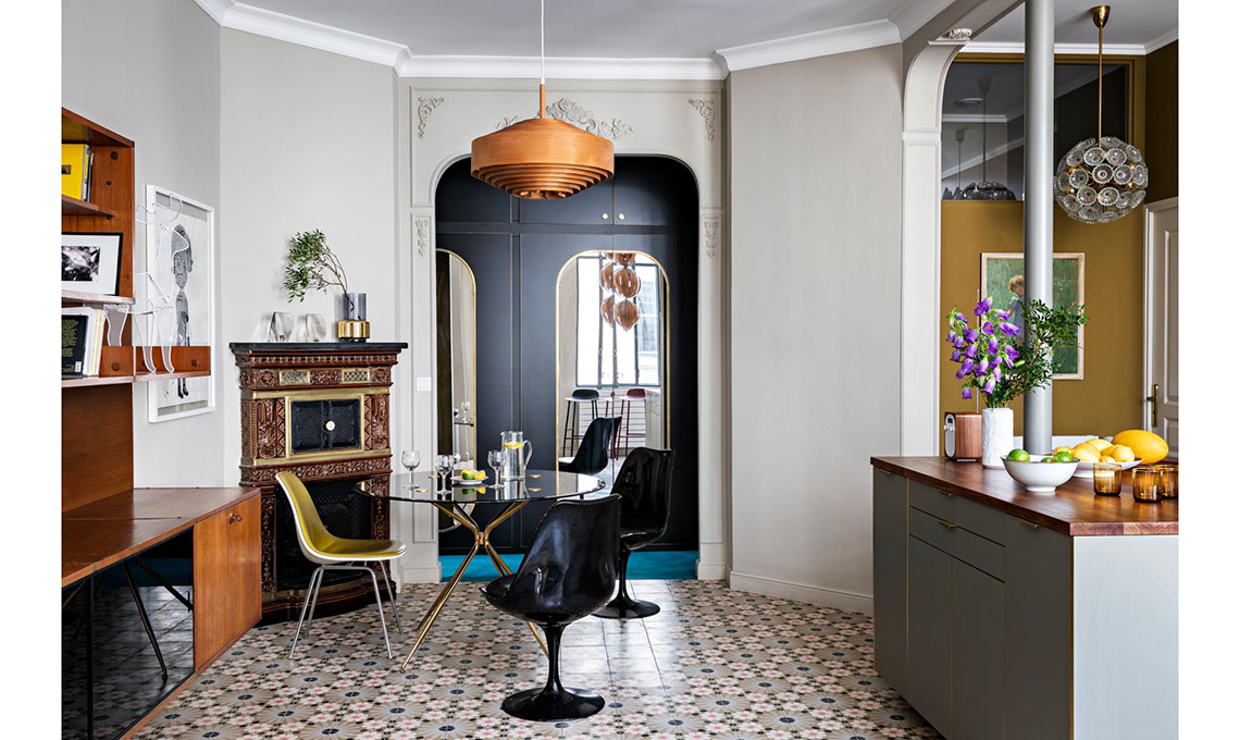 Di oltre 30 mq, la zona pranzo-cucina è pavimentata con cementine decorate che formano un tappeto pittorico: il tocco parigino che puoi portare anche a casa tua!