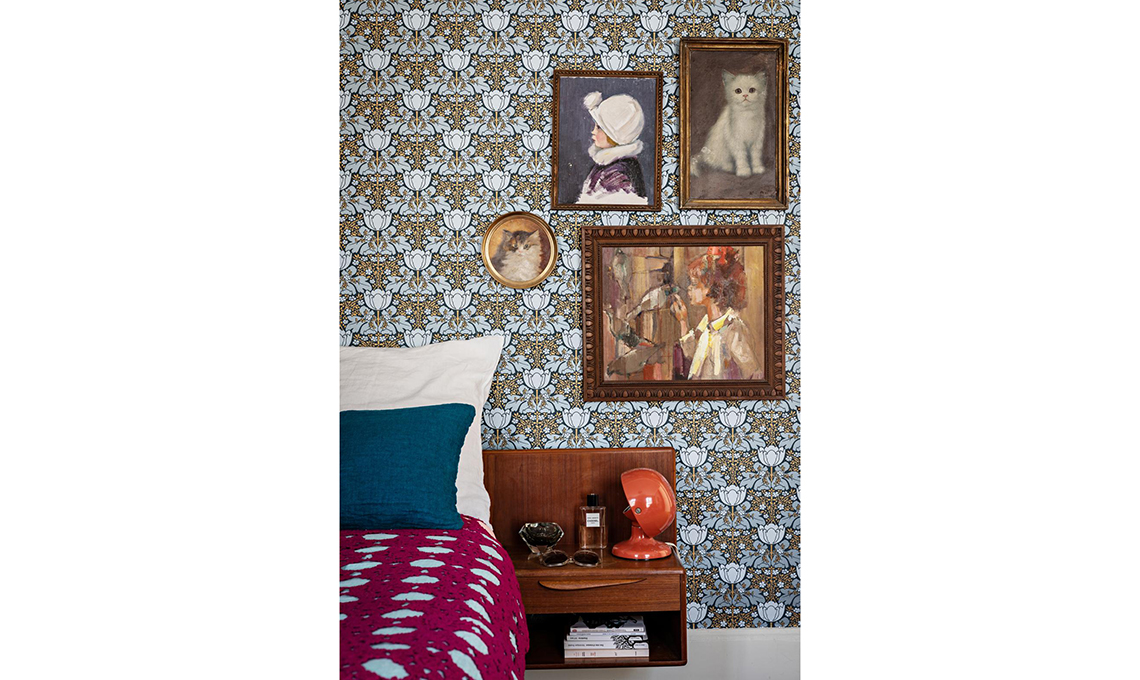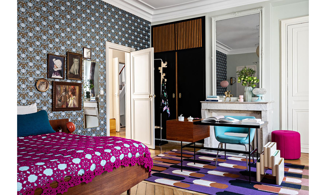 Nella sua camera da letto, Delphine ama mettere in scena dei contrasti ancora più eclettici: da sfondo, la carta da parati, mobili scandinavi e coperta crochet che dà un inaspettato lampo fucsia. Tappeto Oman [Élitis].
