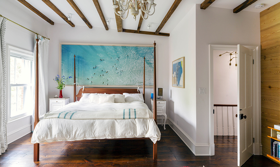 La camera padronale è all’ultimo piano, mentre i figli stanno al piano sotto in due stanze gemelle. Il vero lusso di questa casa è l’ampia sala da bagno, «è la nostra stanza preferita: ci piace la combinazione di bianco e di nero» dice Mike. Qui è particolarmente riuscita perché ‘scaldata’ dal legno delle travi, punto focale della stanza, e dai listoni di risulta che coprono una parete. Mettere al centro la vasca con i piedini ha richiesto la realizzazione, tutt’intorno, di un ambiente rétro: mobile porta-lavabi e specchi sono stati ridipinti. Adesso sembra che tutto appartenga alla stessa epoca!