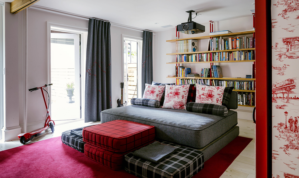 Per avere il cinema in casa basta poco: tende oscuranti, un videoproiettore e... posti a sedere! Con i divani 'trasformisti’ diventa cinema in famiglia, stanza degli ospiti o angolo per le feste dei bambini. Il loro istinto a giocare con gli ambienti si riflette anche nelle scelte décor, come la tappezzeria ispirata alle ‘Toile de Jouy’ di moda nella Francia dell’800.